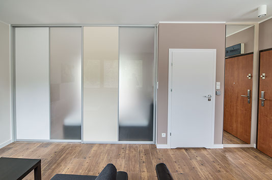 Rozkładana 2 osobowa sofa, szafa z lustrem, TV – 48 cali, sejf