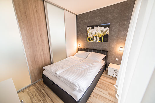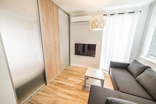 W apartamencie mogą komfortowo nocować cztery osoby, wygodna, obszerna sofa w salonie jest rozkładana, a w sypialni znajduje duże łoże małżeńskie z miękkim zagłówkiem.